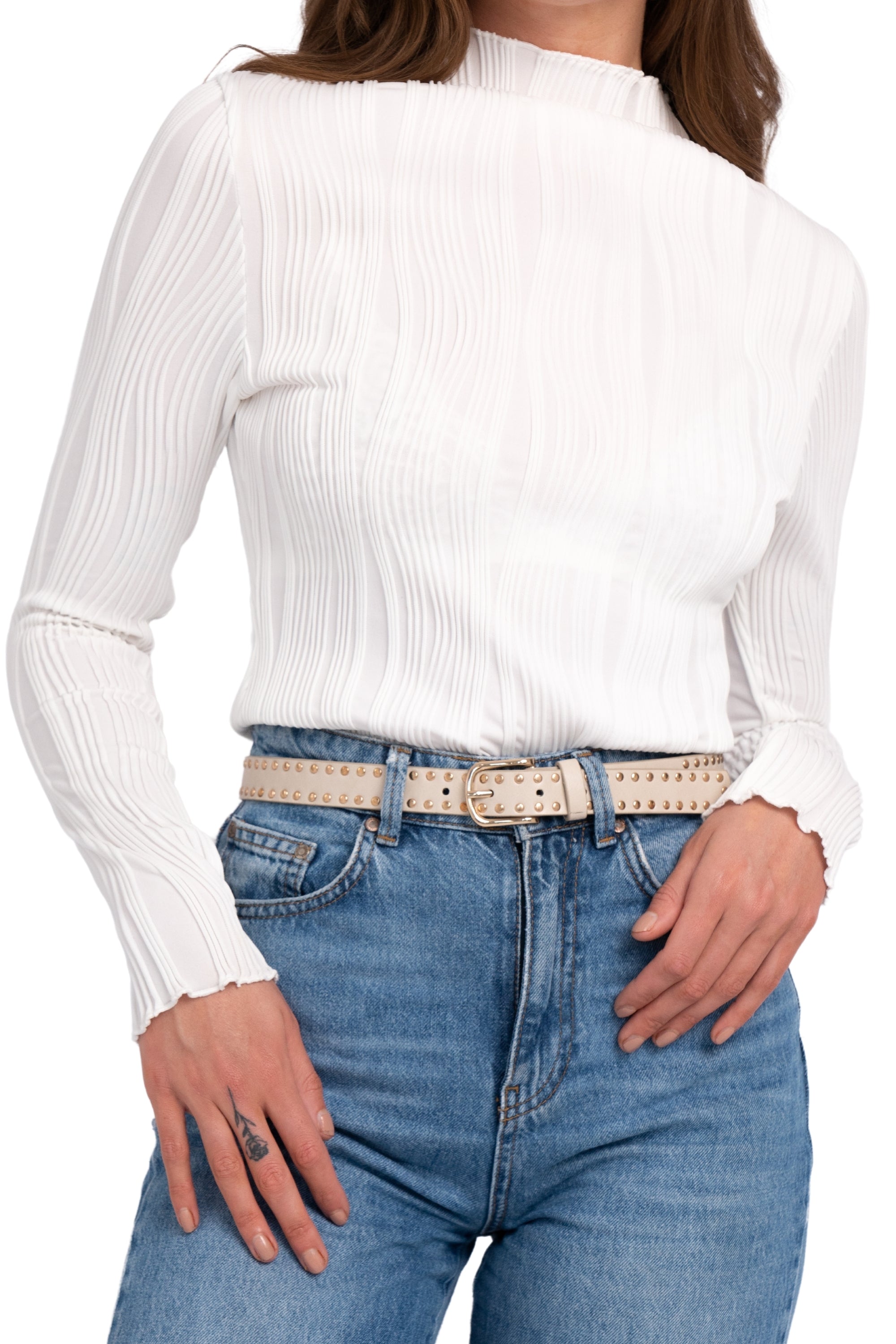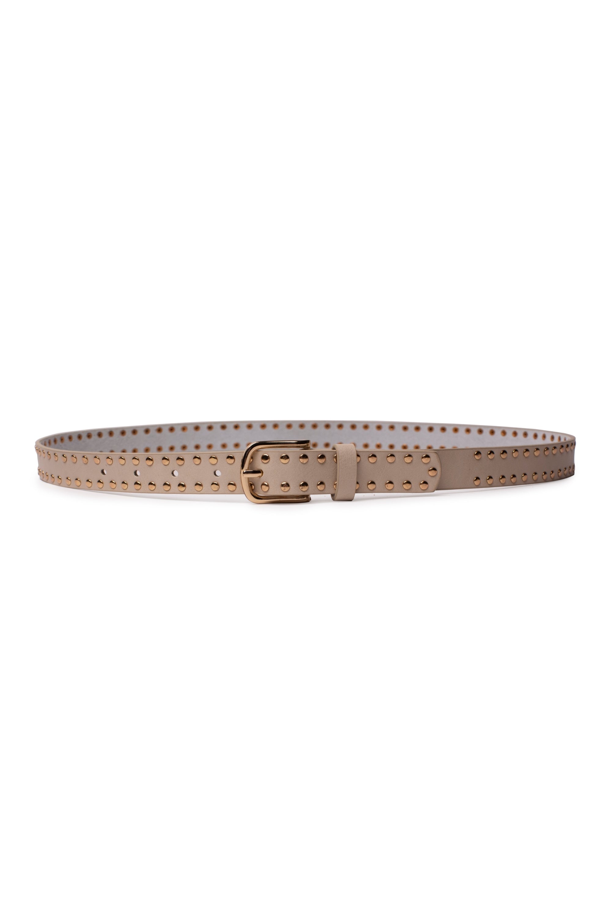 The belt is just as pictured -- it looks beautiful. I love the gold studs. The belt goes blends well for casual occasions with jeans, or even classier occasions. The belt does seem to be of good quality -- I did not see any imperfections. Overall, I'm very happy with the belt and would recommend it.